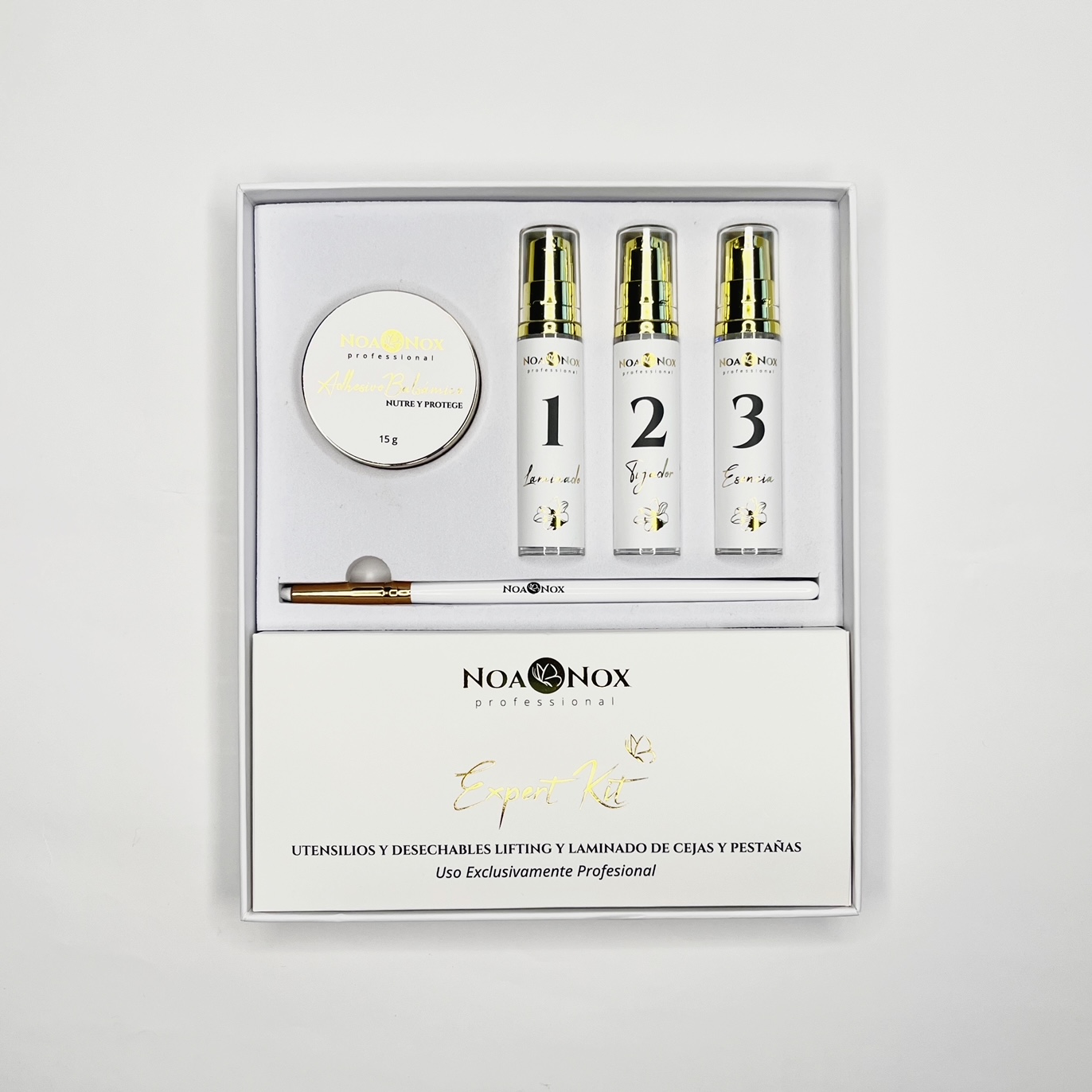 El Expert Kit de Noa Nox es la opción ideal para profesionales que buscan máxima rentabilidad y excelencia técnica en tratamientos de lifting y laminado de cejas y pestañas. Diseñado para elevar las pestañas naturales, aportando curvatura y definición de forma semipermanente, y para alisar, moldear y realzar las cejas con un acabado pulido y glamuroso.